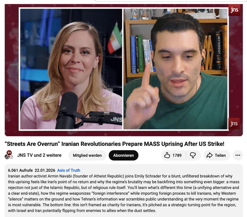 Die Brutalität bei der Niederschlagung der landesweiten Proteste ist gewaltig, aber diesmal haben die Iraner ein klares Ziel. Sie rufen immer wieder Javid Shah, lang lebe der Shah; in einer säkularen Monarchie sehen sie eine Möglichkeit sich zwischen West und Ost zu etablieren. Der Islam ist nicht so verbreitet, wie im Westen angenommen, und vor allem die Jungen, die Frauen, wollen schon lange Veränderung, eine wieder mehr westliche Orientierung. Viele Kanäle, von Iranern im Ausland und von Juden, berichten laufend.