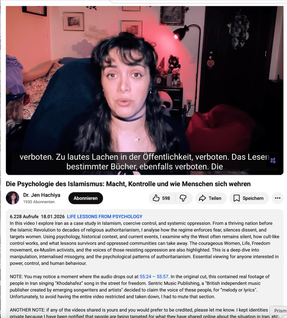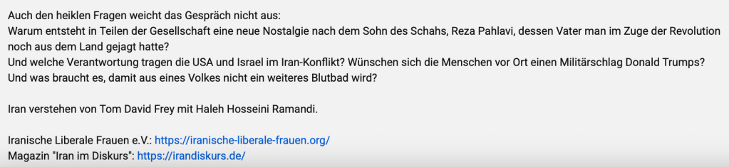 Wenig beachtete Konstellationen der Proteste in westlichen Medien bei Berichten über die elementare Revolte im Iran. Ein Lied welches Freundschaft verspricht, zwischen Iran und Israel, klingt überraschend. Es gibt auch andere Kanäle die eine Freundschaft Israel/Iran wünschen, auf der Basis von Religionsfreiheit in demokratischen Verhältnissen. Die theokratische Herrschaft ist das Problem. (Das Video ist AI) Es gibt aber historische Hintergründe.