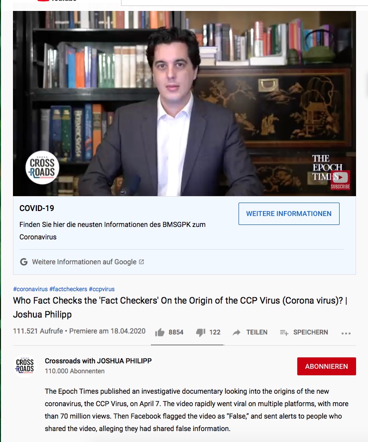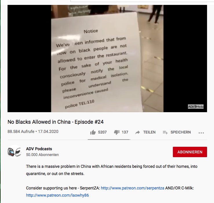 Der Ort (Wuhan), von dem der Virus ausging, darf nicht erwähnt werden, das „verletzt die Gefühle“ und darum wird er jetzt Amerika, aber auch schon Italien angelastet. Bisher hat sich nie jemand aufgeregt, wenn der Ausbruchsort oder vermutete Beginn Namensgeber war, wie „serpentza“ in einem Video ausführt. Die beiden Kanäle sind von Bloggern vor Ort, die mit Chinesinnen verheiratet sind, Kinder haben, neutrale Berichte machen.