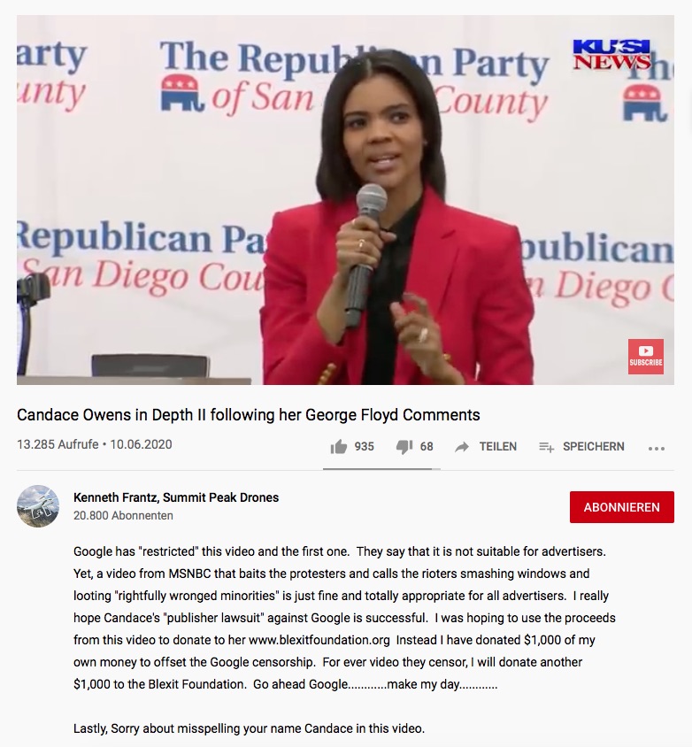 David Dorn, ein schwarzer Polizist, der Diebe in einem Geschäft in seiner Community im Zuge der Ausschreitungen vertreiben wollte, wurde von einem schwarzen ermordet, interessiert niemanden. Der schwarze Polizist war ein unschuldiger, der nie etwas verbrochen hatte, ganz im Gegensatz zu Floyd, der unter anderem bei einer schwarzen Schwangeren mit einer Gruppe eingebrochen war, ihr die Pistole an den Bauch gehalten hatte, die Gruppe konnte nur ein Handy und die Geldbörse erbeuten und wurde durch aufmerksame Nachbarn der Polizei gemeldet, Floyd verbrachte eine Gefängnisstrafe, nicht die einzige in seinem Leben, und war erst wenige Monate vor seinem Tod durch den weissen Polizisten wieder frei gekommen. Die ganze Welt verehrt Floyd wie einen Märtyrer, aber Candice Owens Video wurde gelöscht, wie oben zu sehen, weil sie sich erlaubt hatte mitzuteilen, dass das nicht „ihr Märtyrer“ sei.