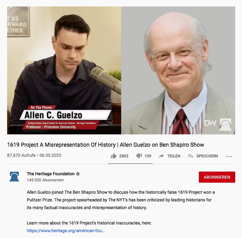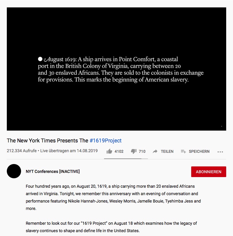 Laut diesem New York Times Projekt ist der Beginn, die Gründung der Vereinten Staaten von Amerika nicht mit der „Deklaration der Unabhängigkeit von 1776“ zu setzen ?!? wie auch seither verstanden und gelehrt, sondern ?!? ganz neu einfach so in den Raum gestellt, mit der Ankunft eines Schiffes in Jamestown, Virginia, 1619, welches 20 Sklaven mitbrachte. Das war der Beginn der Sklaverei in USA, allerdings keineswegs auf der Welt. (Schwarze Sklaven wurden von schwarzen Sklavenhändlern an Farmer verkauft, der erste Sklavenhändler in USA war ein Schwarzer) Sklaven und Sklavenhandel gab es in vielen Ländern und Hautfarben. Wie kann so eine Markstein gesetzt werden und warum? Nach erfolgter Markierung der Tatsache der Landung von 20 Sklaven in USA 1619, wird ein Konstrukt, das besagt und beweisen will, dass es in USA vorwiegend um die Sklavenhaltung (Schwarzer) ging und die USA daher ein rechtloses rassistisches Land war + ist ?!?