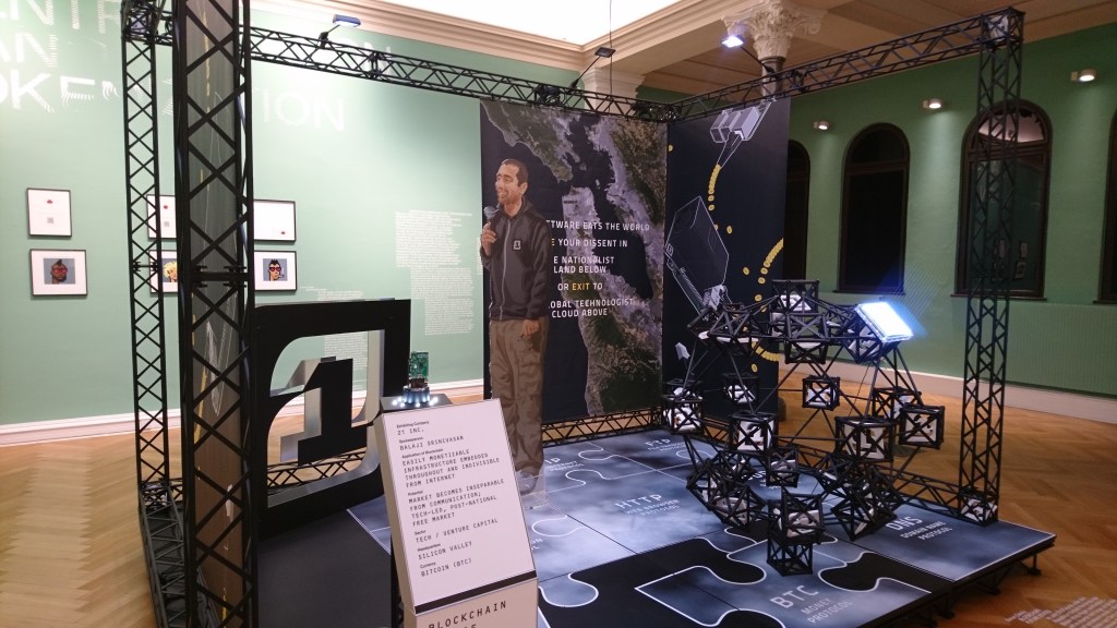 Im Hintergrund dieser Installation, die sich mit der Blockchain auseinandersetzt, sind einige der kleinen, wie Logos aussehenden Crypto Art Werke mit ihren Zertifikaten ausgestellt – sie sind meistens nicht von als Künstler ausgebildeten Personen.