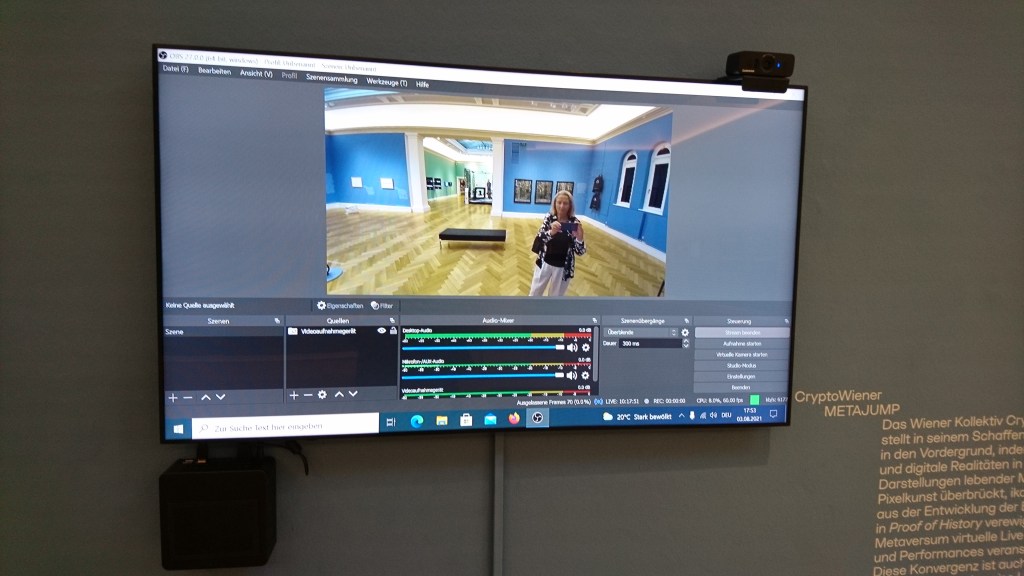 Der Blick hinaus deutet die üppige historische Fassade an (und das Gerüst) nach innen drängt das „Metaverse“. Die neuesten Künste machen sich gut im historischen Ambiente. PROOF OF ART, eine kurze Geschichte der NFTs, von den Anfängen der digitalen Kunst bis zum Metaverse greift tief in Anfänge und bindet an bekannten Pionieren wie Herbert Franke, Nam June Paik und Lynn Hershman an. Der plötzliche Hype der NFTs am Kunstmarkt ist nur der „Aufhänger“ für die Ausstellung, die vor Ort, aber auch im Netz, das heißt einem Ableger, dem DFC Francisco Carolinum stattfindet, was auch in Zukunft Sinn macht für die Ausrichtung des Museums auf Fotografie und Medienkunst.