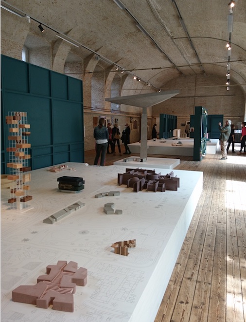 Die Modelle zu den Projekten sind in eine gezeichnete Landschaft gesetzt – in Schaukästen befinden sich Materialien die für die gemeinsame Bearbeitung mit den späteren Nutzern gefunden und arrangiert wurden. Sie ergeben schon vorweg ein Bild. Auffällig ist die Vielfalt der Materialien und Farben.