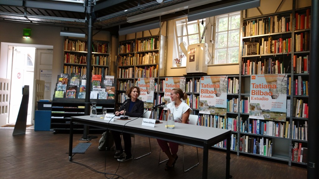 Tatiana Bilbao in der Bibliothek des Architektur Zentrum Wien mit der Direktorin des AZW anläßlich der Pressekonferenz: Landschaft ist ein breiter Begriff