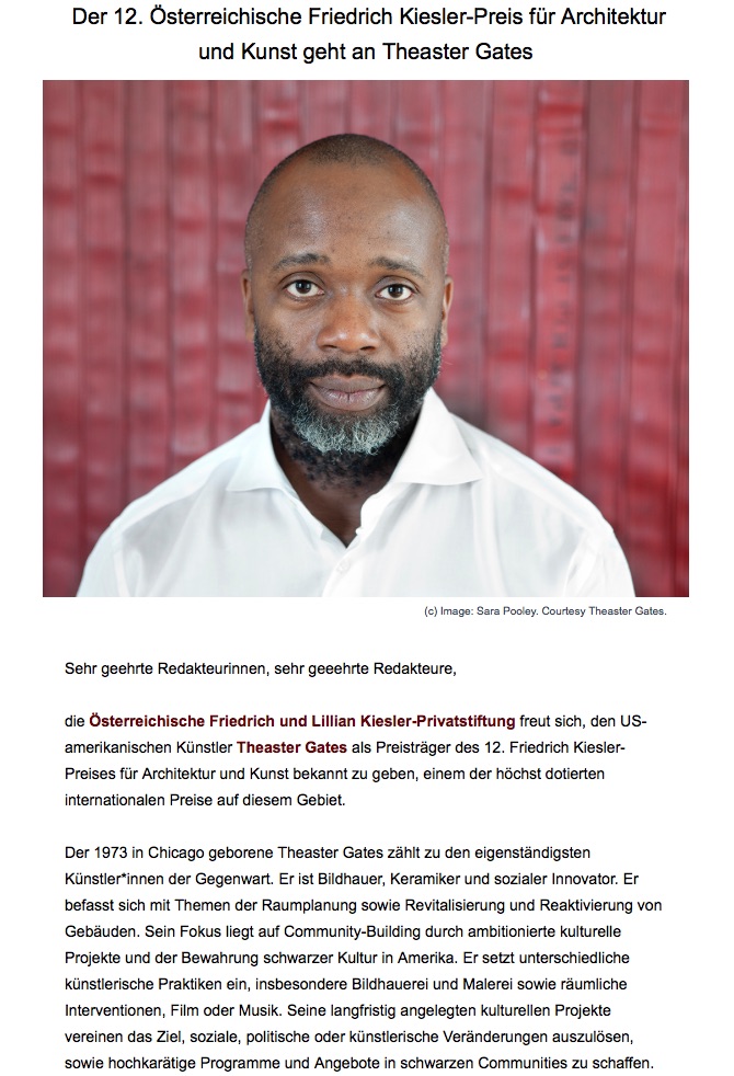 THEASTER GATES BEKOMMT NUN DEN WICHTIGSTEN PREIS FÜR KUNST IM ÖFFENTLICHEN RAUM DER IN ÖSTERREICH VERGEBEN WIRD. AN DER SCHNITTSTELLE VON ARCHITEKTUR, KUNST UND SOZIALER PRAXIS, HATTE GATES DIE ARTBANK, EINE VERLASSENE BANK IN EINEM HERABGEKOMMENEN QUARTIER 2016 ZU NEUEM KUNST-LEBEN ERWECKT (SIEHE VIDEO) NEBEN EINEM LITERATURHAUS UND EINEM FILMHAUS. LEIDER HAT CHICAGO NICHT WEITER NOCH BREITER IN DIESEM „KÜNSTLERISCHEN“ STIL FÜR SCHWARZE QUARTIERE GEARBEITET MIT DER NEUEN BÜRGERMEISTERIN (SCHWARZE LESBE)