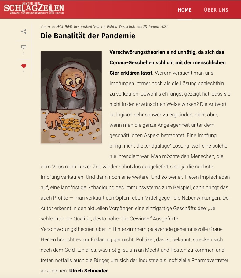 Dank unabhängiger Filmemacher ist immer wieder zu sehen, dass das Narrativ der angeblichen „Qualitätsmedien“ ebenso nicht stimmt, wie die das Volk schmähenden Statements von fast allen Politikern, außer, eben konservativen/rechten, die tatsächlich Recht haben….davon kann man sich ja überzeugen, wenn man auch mal mitzieht. „Mit uns in die Neue Zeit“ war einst ein Motto der SPÖ, jetzt unterstützen sie Angstmache und Pharma- und Digitalgiganten.
