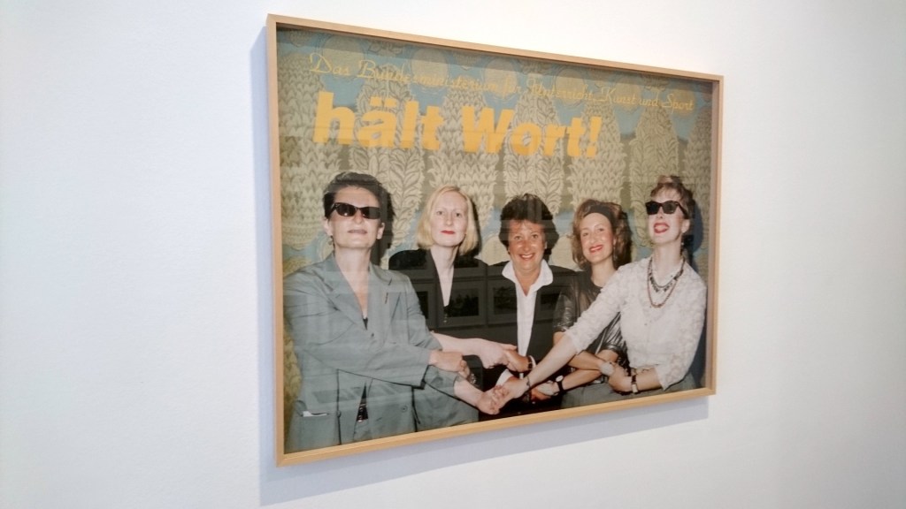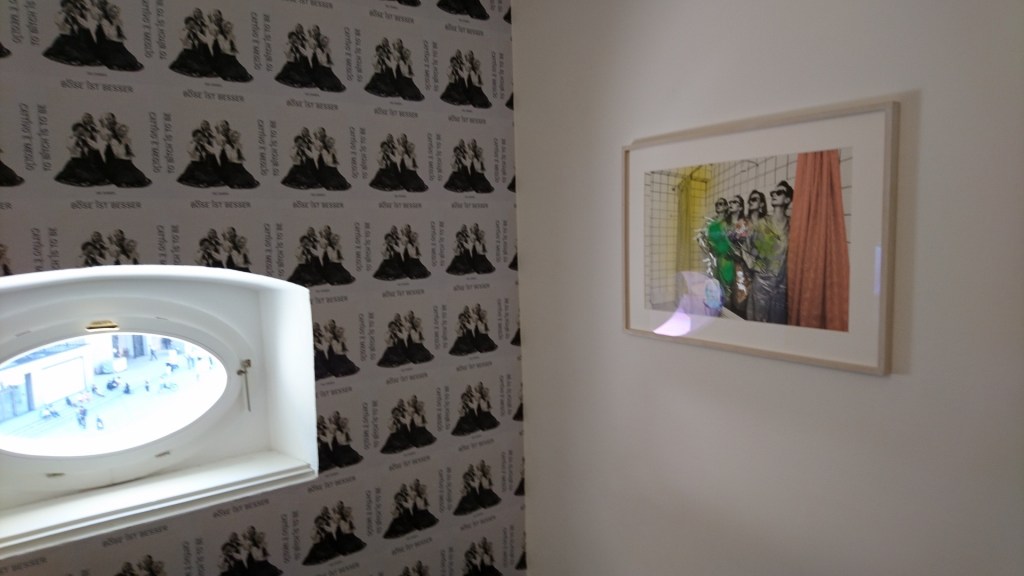 Die Damen sind im Rupertinum in einen Kontext geraten. Offenbar werden die beiden Häuser „thematisch“ bespielt. Zum Thema Böse Lust / Fatale Liebe paßt die Tapete, die hier kreiert wurde, und die Phase der Damen, als sie nach dem Abgang einer Dame mit einem bekannten Künstler das Quartett auffüllten und tatsächlich eine Aktion „böse ist besser“ machten.