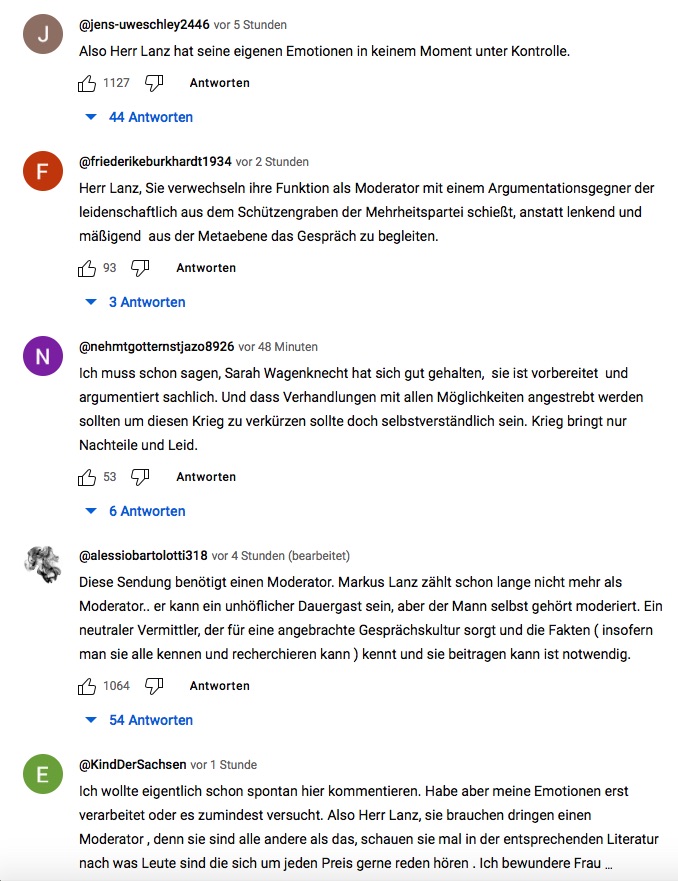 Vorangestellt, Krissy Rieger (Ukrainerin in Deutschland mit super Diskussions-Kanal) und Daniele Ganser (Schweizer Friedensforscher) stellen die Stimmen der Vernunft und Empathie. Weltweit sieht man den Konflikt mit Bedauern und nicht so eindimensional.