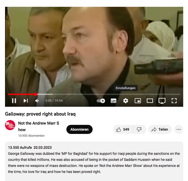 Ja, es gibt sie, die seriösen Politiker und Medienschaffenden, im Falle von George Galloway zuerst Politiker der sich umsonst für den Iraq einsetzte und die behaupteten Beschuldigungen bezüglich Saddam Hussein als gegenstandslos zurückwies….heute ist er ebenso engagierter und professioneller Medienschaffender.