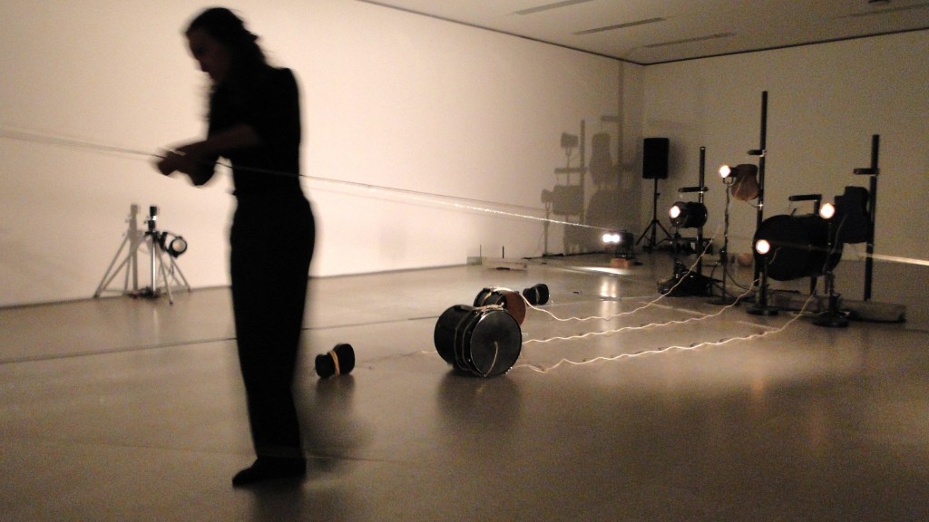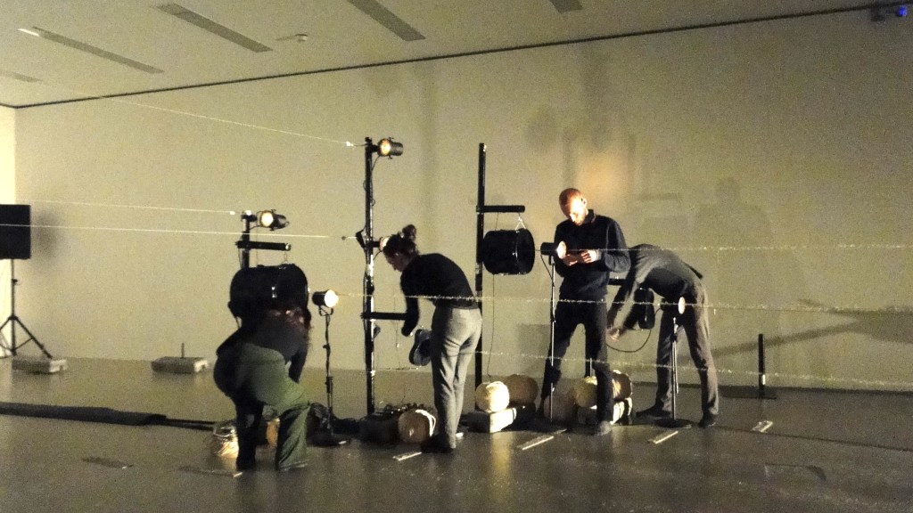 Die Aufführung erfordert absolute Stille und Konzentration. Die vier Musiker bewegen sich entlang gespannter Fäden aus unterschiedlichem Material welche mit Resonanzkörpern verbunden sind. Die Schwingungen, Berührungen, erzeugen die Klanginstallation und die Bewegungen der Musiker im fast finsteren Raum, sowie deren Schatten sind die Choreografie im Bühnenbild der Spulen, Klangkörper, Fäden und Lichtquellen.