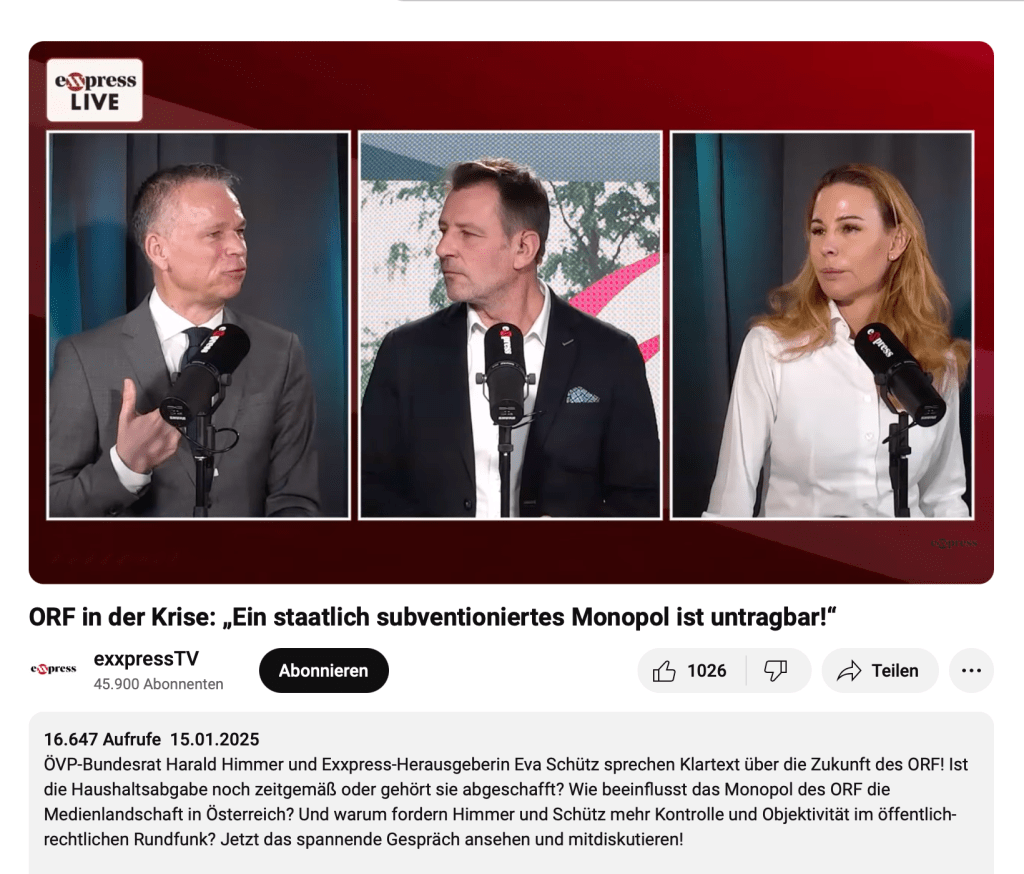 Die MEDIENDEBATTE hat endlich auch zu einer realistischen Form gefundenen in Österreich auf exxpress……genau…..Nachrichten und Gespräche zu Politik und Gesellschaft gibt es auf der ganzen Welt und viele Sender kann man in englischer Sprache wahrnehmen und vergleichen. Öffentlich/rechtlich? was meint das überhaupt? Ist Objektivität vorhanden oder überhaupt möglich? Bewährt sich da nicht weit eher der Vergleich einiger unterschiedlich ausgerichteter Medien? Und, vor allem, Zwangsmitgliedschaft, zwanghafte Bezahlung für etwas das man nicht konsumiert geht gar nicht.