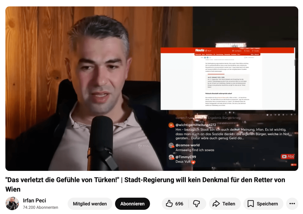 In Wien gibt es eine spezielle Situation, weil historisch gesehen war Wien mal der Stop für die Osmanen, also sozusagen die Rettung für das Abendland. Wien hatte damals auch entscheidende Hilfe von den Polen. Jetzt gibt es konkret eine recht seltsame, feige Situation, die Polen wollen uns ein bereits erstelltes Denkmal für den konkreten Ort der Auseinandersetzungen schenken, am Kahlenberg sollte es stehen, aber die Stadt Wien traut sich nicht, und wimmelt es ab. Das wieder versteht ein bekannter ExMuslim nicht, und äußert sich dazu.