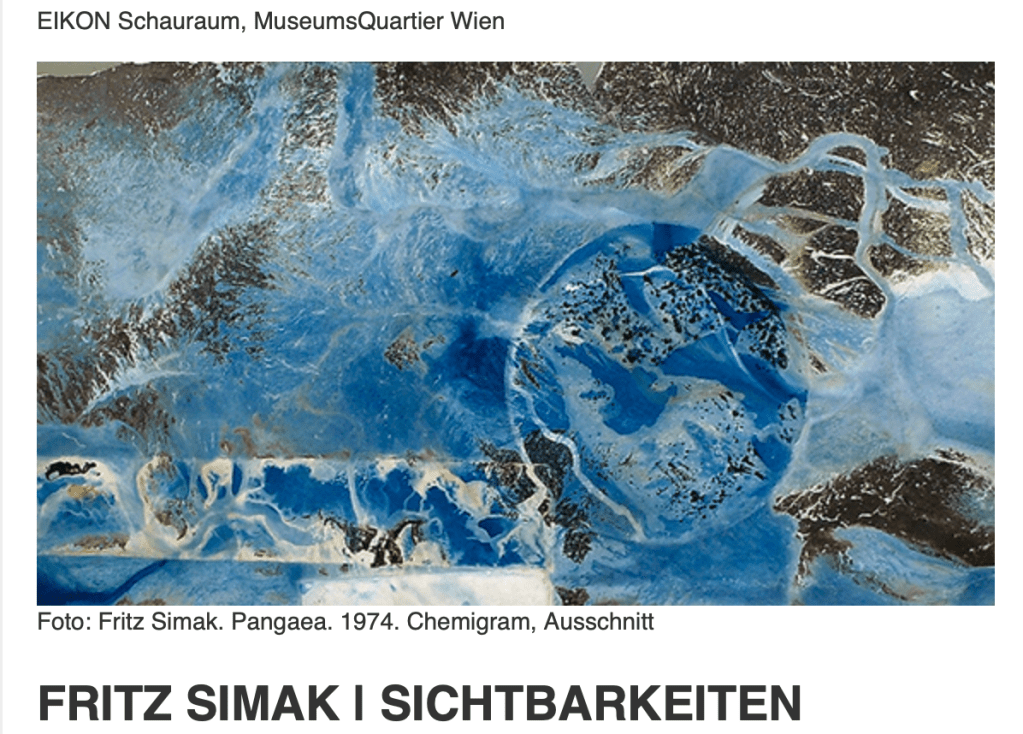 Im Zusammenhang mit dem neuen Buch über Fritz Simak wurde eine kleine, überraschende, und sehr poetische Auswahl aus dem Werk des bekannten Fotografen und Sammlers im Schauraum gezeigt. Ein sehr frühes Werk zieht die Aufmerksamkeit an, die Praxis mit riesigem Fotopapier in freier Luft zu experimentieren. Auch andere Bilder spielen weit eher mit Realitäten, als sie abzubilden, es sei denn, man will hinter Zeit und Raum blicken, einen Zustand beschreiben oder gar kreieren. Vor allem macht es Sinn, der Entwicklung eines Künstlers zu folgen, von frühen Artikulationen bis zur Gegenwart, statt einzelne Phasen in gerade passenden Kontexten zu zeigen, wie meistens.