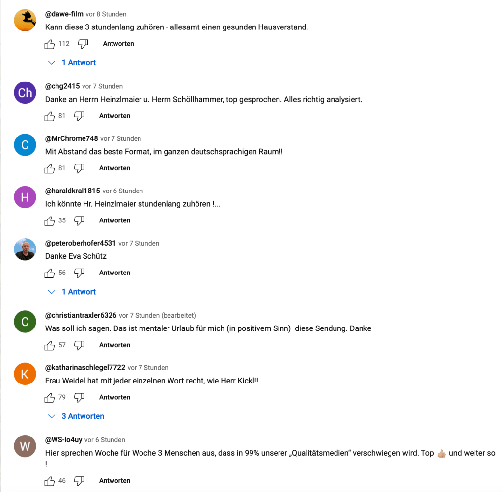 In Österreich gibt es neben den wiedererwachten Donnerstagsdemos, die genau auch diese einseitige Haltung als Demokratie verstehen wollen, den Nachtflug von Exxpress, auch donnerstags der wohltuend entspannt und rational die jeweils aktuelle Lage bespricht.