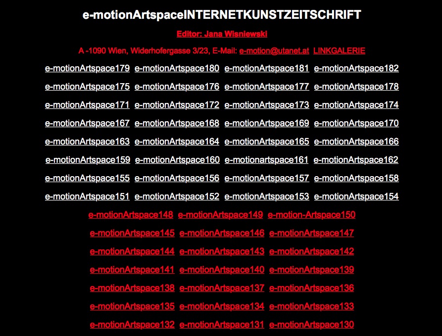 Archiv e-motionArtspaceINTERNETKUNSTZEITSCHRIFT Archiv ist nach wie vor auf http://e-motion-artspace.net abrufbar.